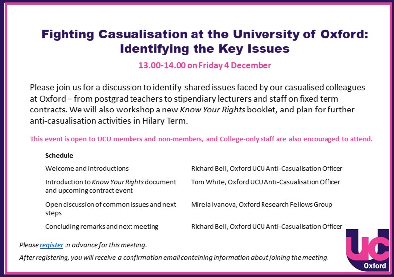 Join us at the next anti-cas event, Fighting Casualisation at the University of Oxford: Identifying the Key Issues, on 4 December, 1-2pm. Register for the event here.