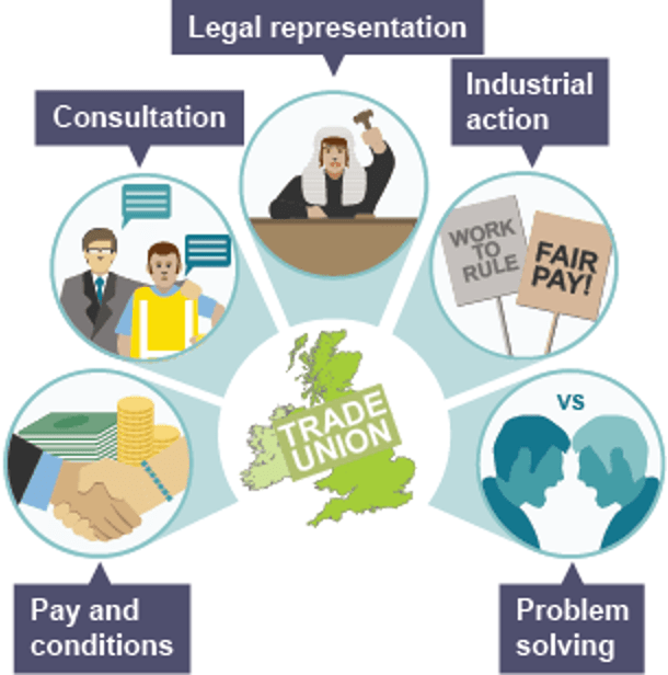 Trade unions are organisations of workers who have common interests. They represent workers in negotiations with employers over terms and conditions (e.g. pay and workplace safety) and they protect workers in disputes over things like discrimination or unfair treatment, workload/job conditions, redundancy, etc.