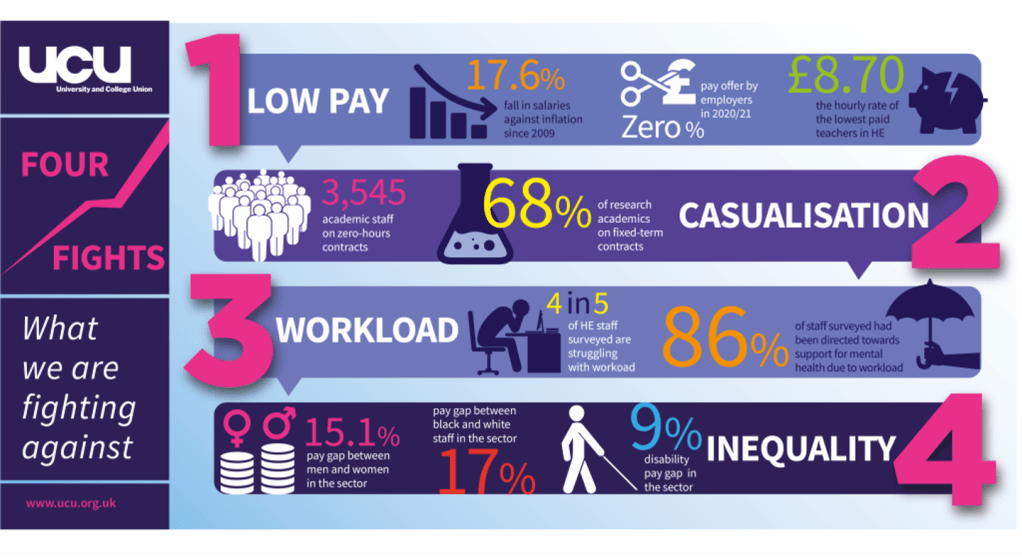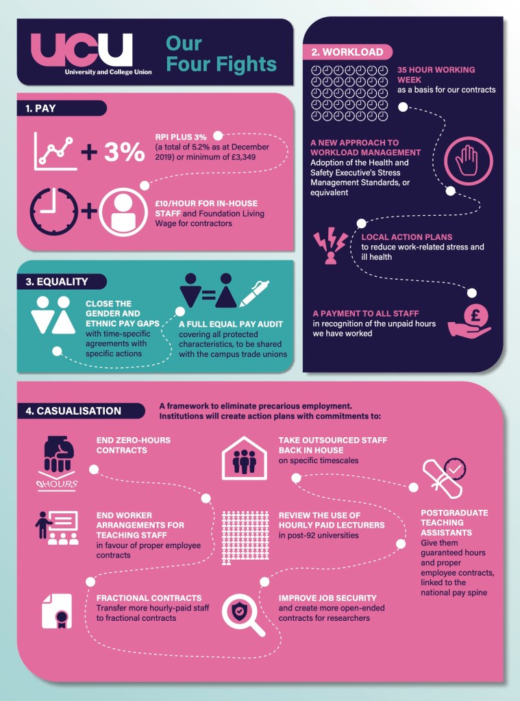 The other part of the UCU Rising campaign is called the Four Fights dispute, which is about pay, the gender and ethnic pay gap, workload as well as casualisation in Higher Education. There was some progress last year, but in general these are still central issues for UCU.
